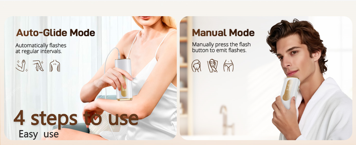 Modes of Operation: Auto-Glide Mode for large areas (legs, arms) and Manual Mode for small or sensitive areas (face, underarms, bikini line).