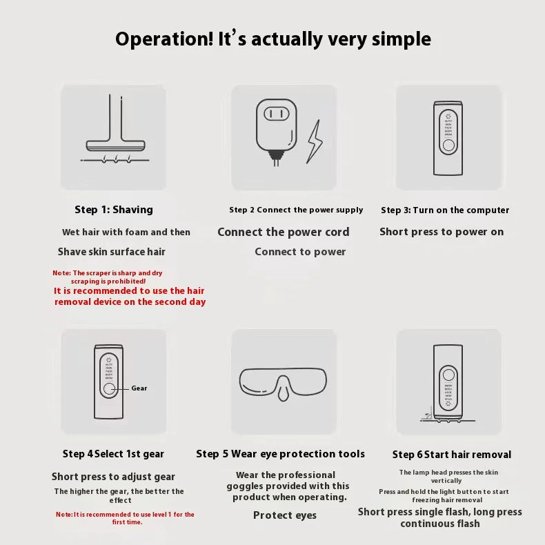 Usage Guidelines: Always test on a small skin patch before full use. Wear protective goggles during sessions. Never flash directly toward the eyes. Skin must be clean and free of creams, deodorant, or makeup. Max session: 20 minutes per area. Recommended: once every 2–4 weeks, then maintenance sessions as needed.